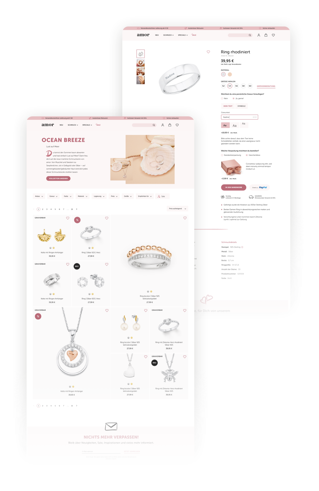 Kategorieseiten und eindeutig gestaltete Filterfunktionen erleichtern es den Besuchern, aus der breit gefächerten Auswahl punktgenau und in Sekundenschnelle die Lieblingsschmuckstücke zu finden und nach Interesse zu clustern. Ergänzende Social-Media-Module tragen die Botschaft der Marke AMOR weiter über die Webseite hinaus in die digitale Erlebniswelt.
