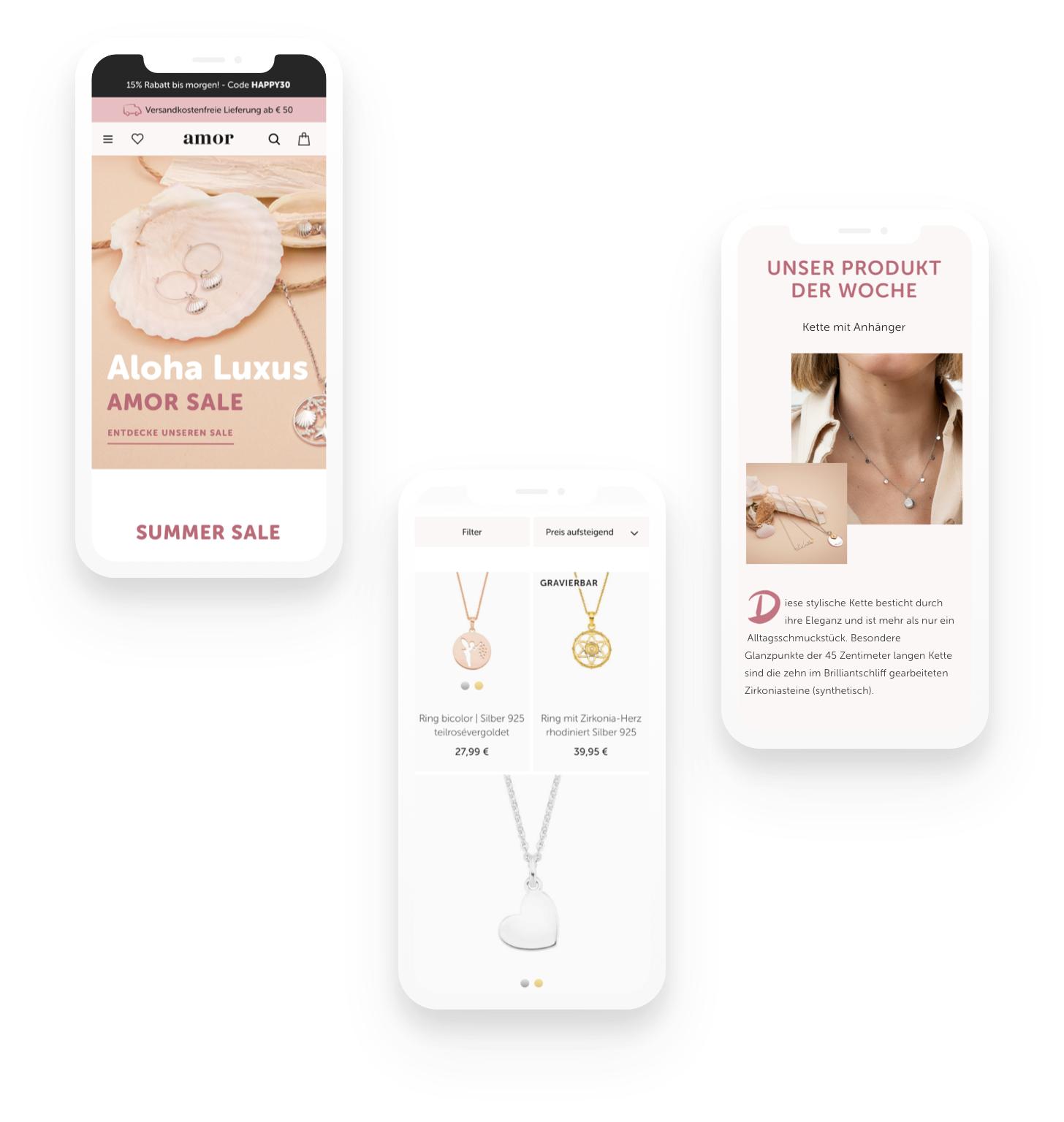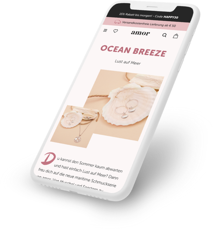 Die Markenbotschaft von AMOR vermittelt sich schon beim ersten Klick dank vieler Designelemente, die harmonisch miteinander verwoben sind und ein vielversprechendes Kundenerlebnis erlauben. Dieses positive Erlebnis gilt vor allem für das wichtigste Verkaufsportal: die mobile Seite von AMOR.de. Mobil First in Spitzenqualität.
