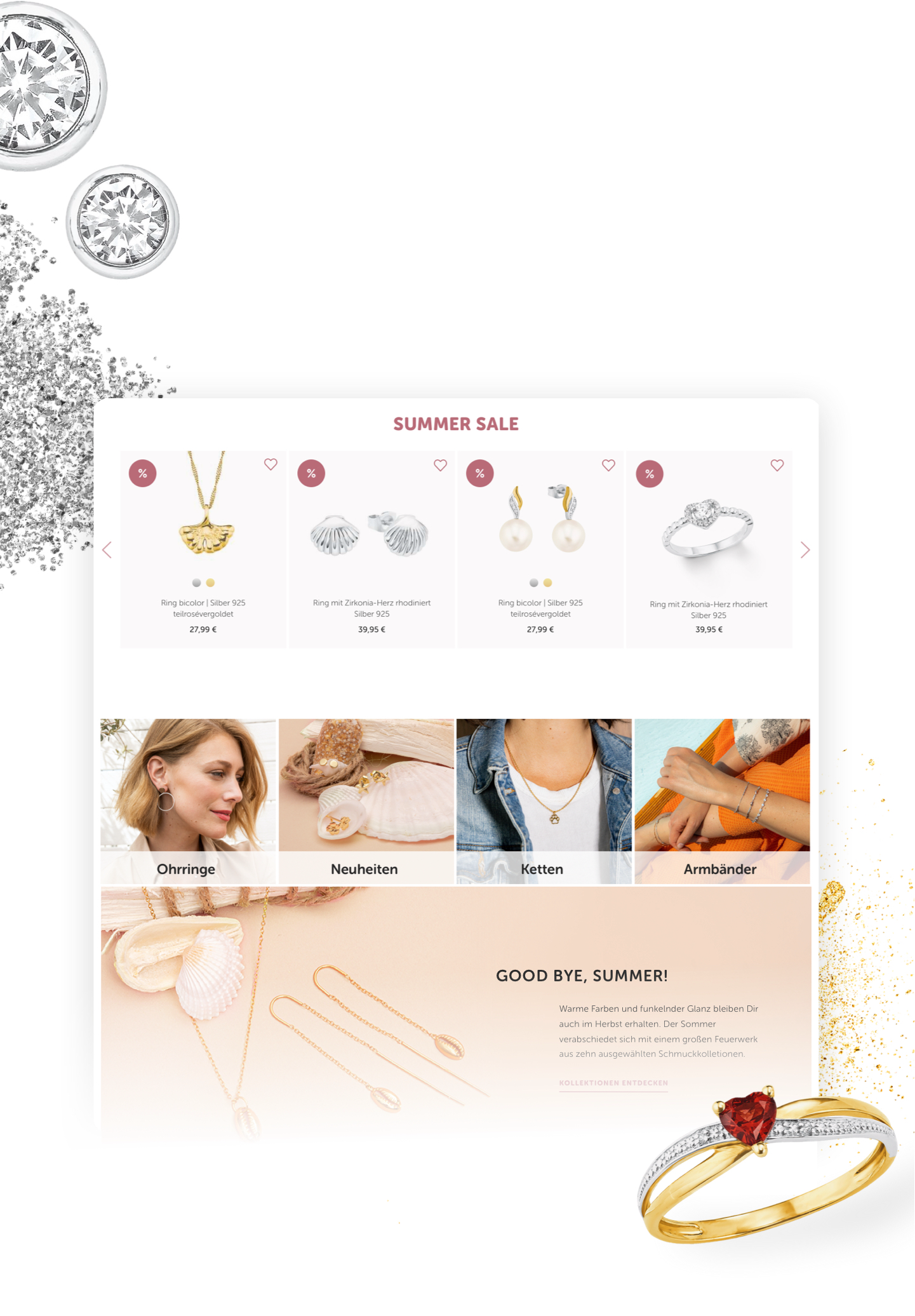 Startseite und verschiedene Landingpages begeistern die Nutzer mit inspirierenden Inhalten unterschiedlicher Module, die je nach Bedarf und Nutzungskontext modular zusammengesetzt werden können. Eine eindeutige Designsprache lässt die Seite sympathisch, leicht, aufgeräumt, nicht zu geradlinig und individuell wirken. Die vornehmlich weibliche Kundschaft wird emotionalisiert durch großflächige und detailreiche Bilder des Schmucks. Durch gefälliges Storytelling wird die Phantasie der Kundschaft angeregt und verstärkt die Emotionalisierung. Die Website vermittelt Qualität und lädt ein zum Stöbern und Kaufen.