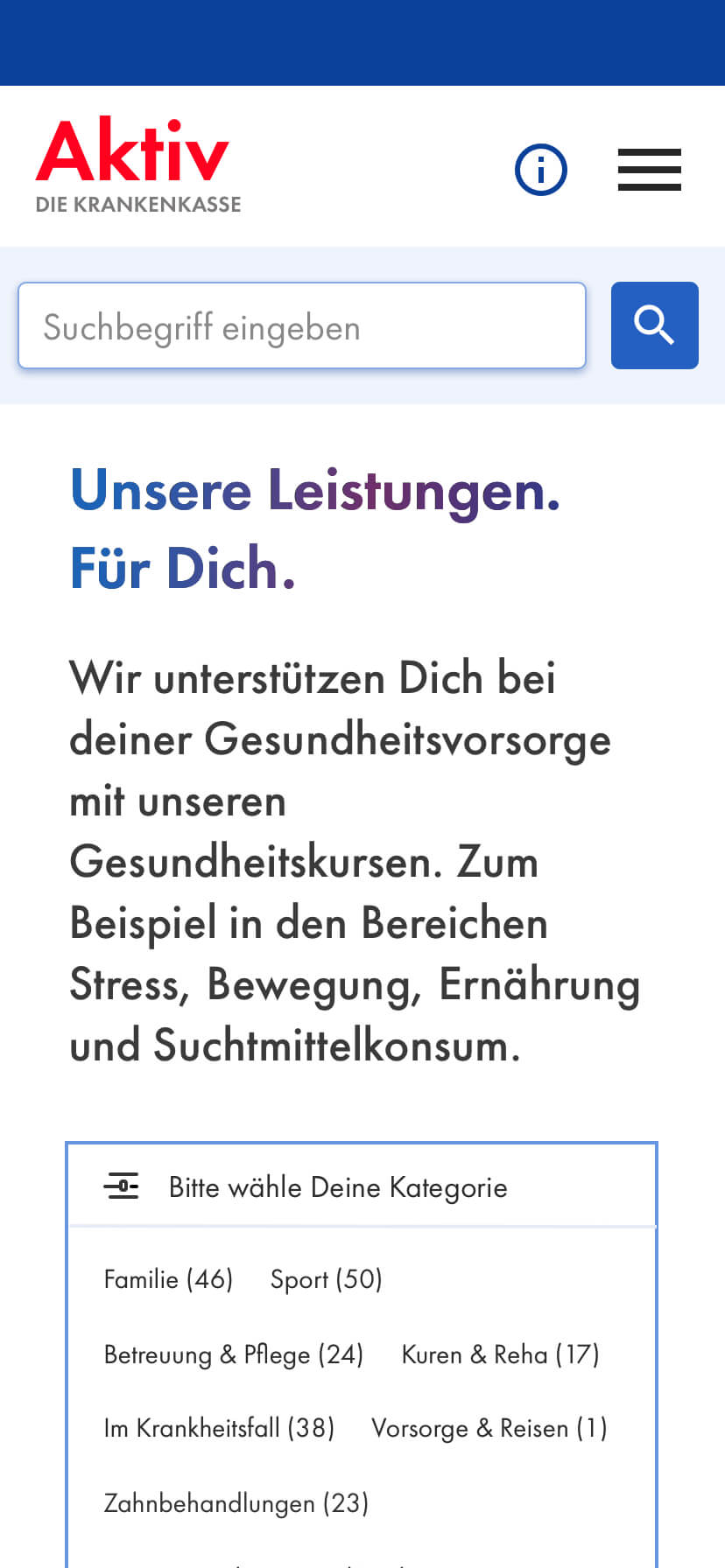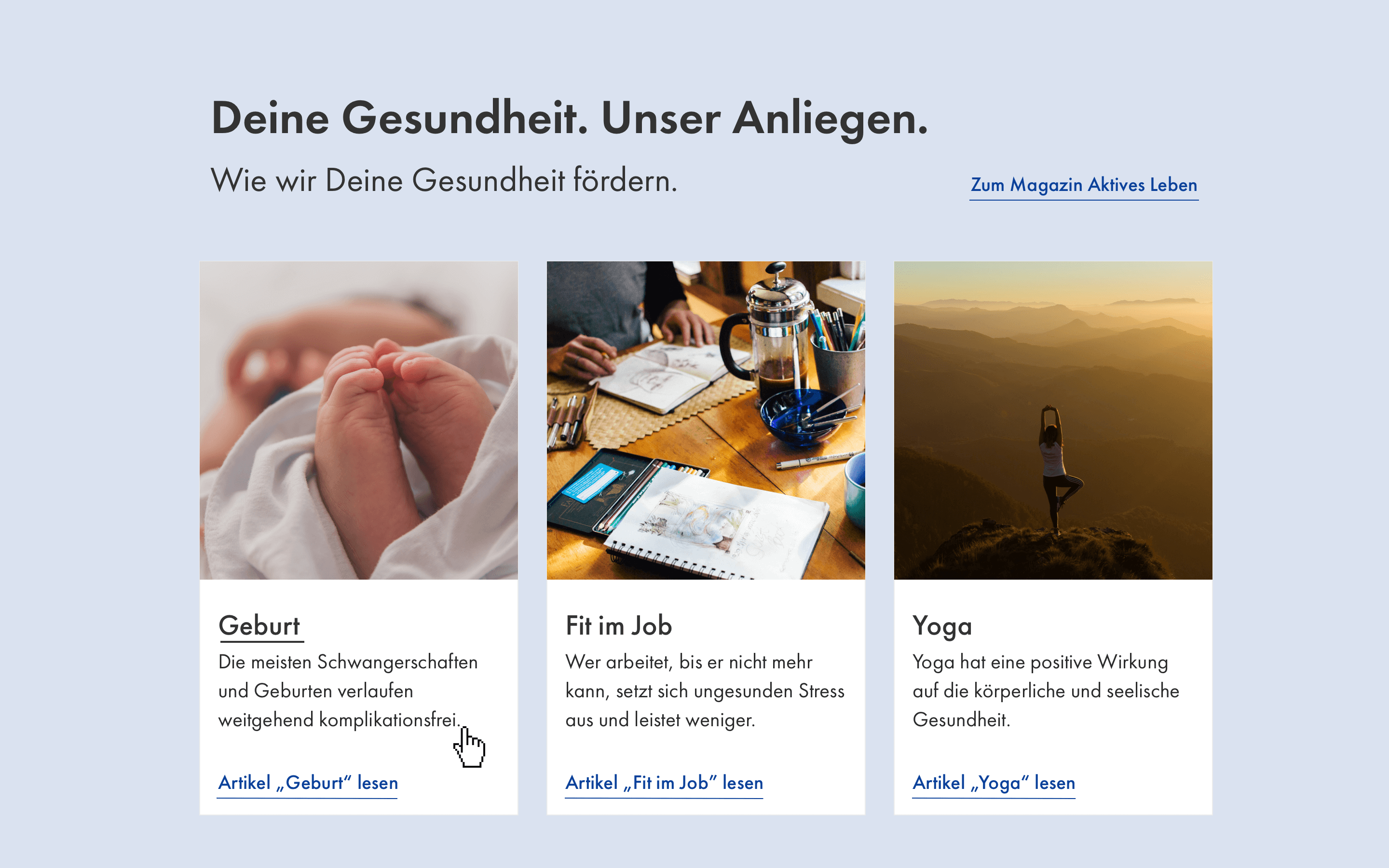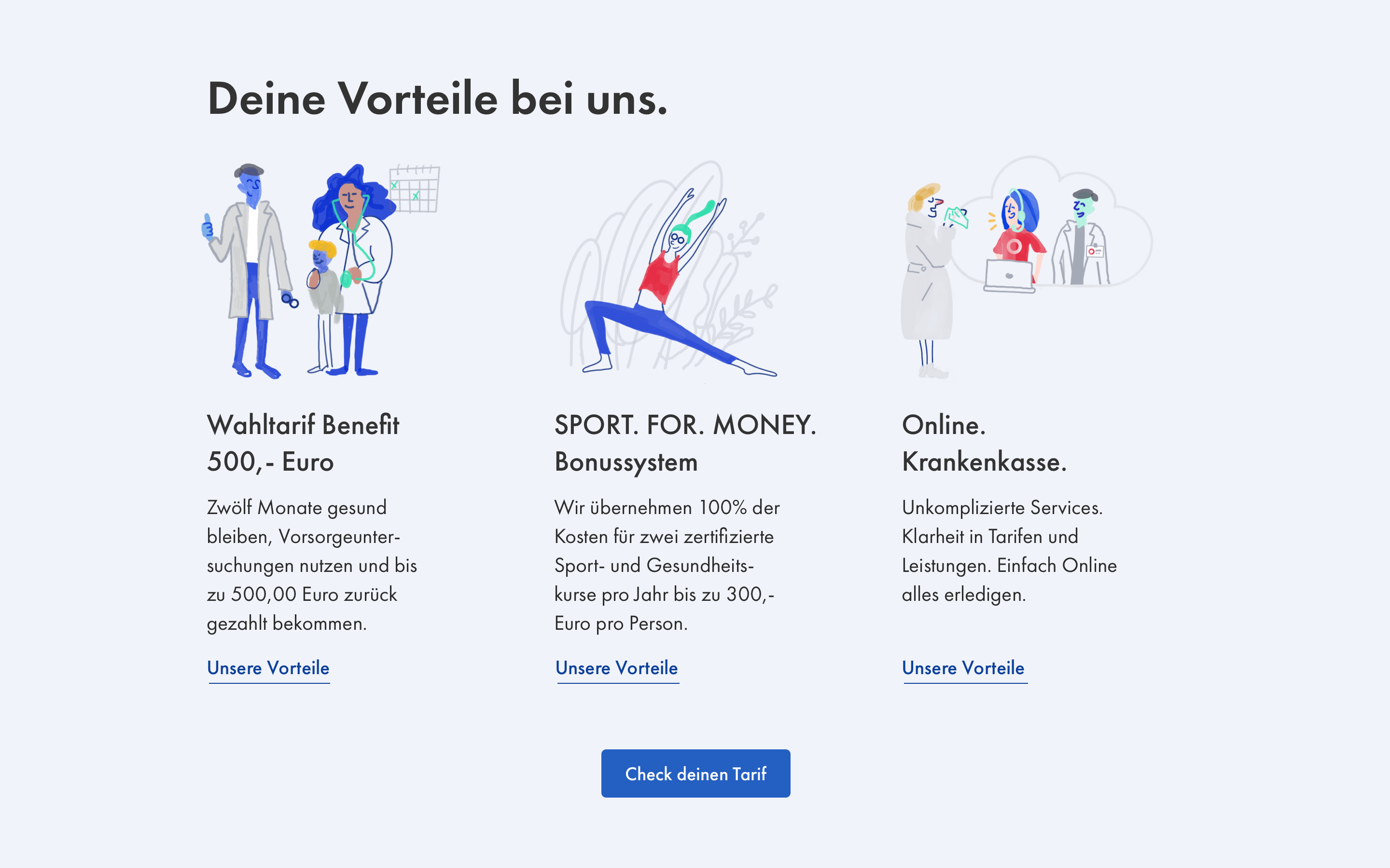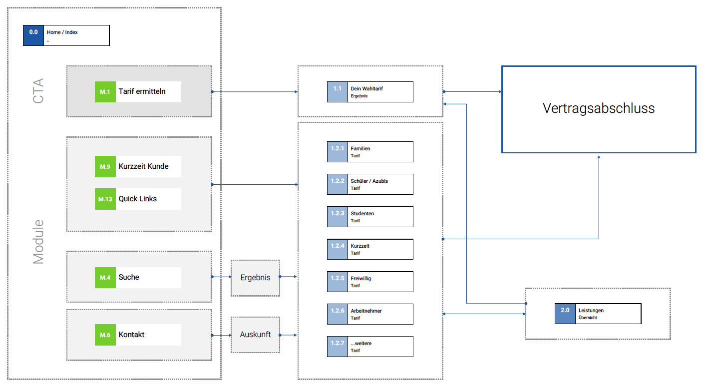 Mit all den Optionen, die den Nutzern verschiedene Einstiegsmöglichkeiten auf der Website eröffnen, um gewinnende Begeisterung zu schaffen, legen wir den Grundstein für eine neue Generation der Krankenkasse. Die Gesundheitsbranche befindet sich im stetigen Wandel und das bedeutet zuvorderst Flexibilität. Diese drückt sich elementar in unserer Modularität aus, die ein zukunftssicheres Auftreten bietet, das sich auch an alle zukünftigen Eventualitäten anpasst.