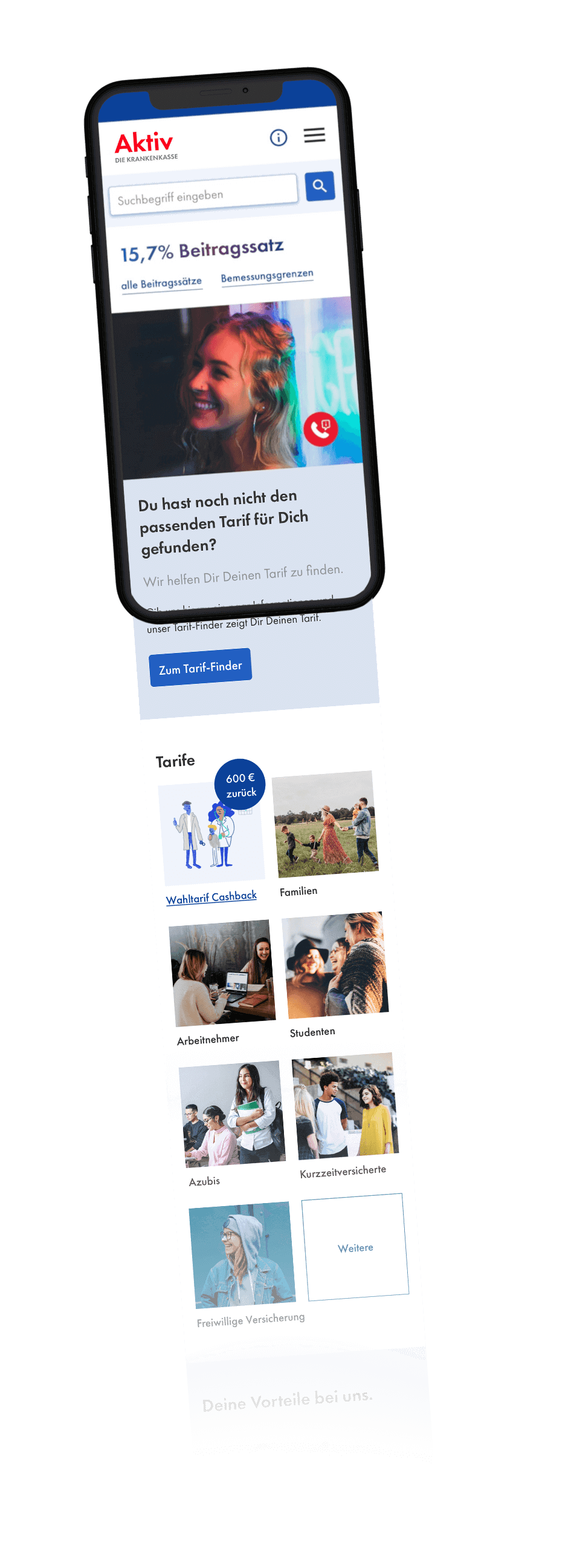 Der Tarif-Finder ermöglicht dem Nutzer, schnell und unkompliziert seinen individuell passenden Tarif zu entdecken. Spielend, durch Bildkacheln navigiert, kann er, je nach Lebensverhältnis, seinen gewünschten Tarif direkt auf der Seite ermitteln.